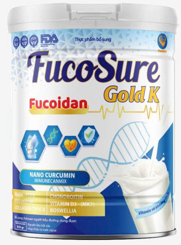 FucoSure Gold K là thực phẩm bổ sung dinh dưỡng dạng bột, được phát triển dành cho người trưởng thành, đặc biệt phù hợp với người trung niên – cao tuổi hoặc người cần tăng cường sức đề kháng, hỗ trợ xương khớp và nâng cao sức khỏe toàn diện.